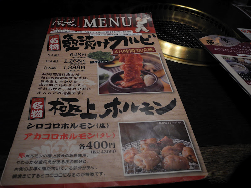 The cover page of the food menu of Boku-zen Yakiniku Restaurant