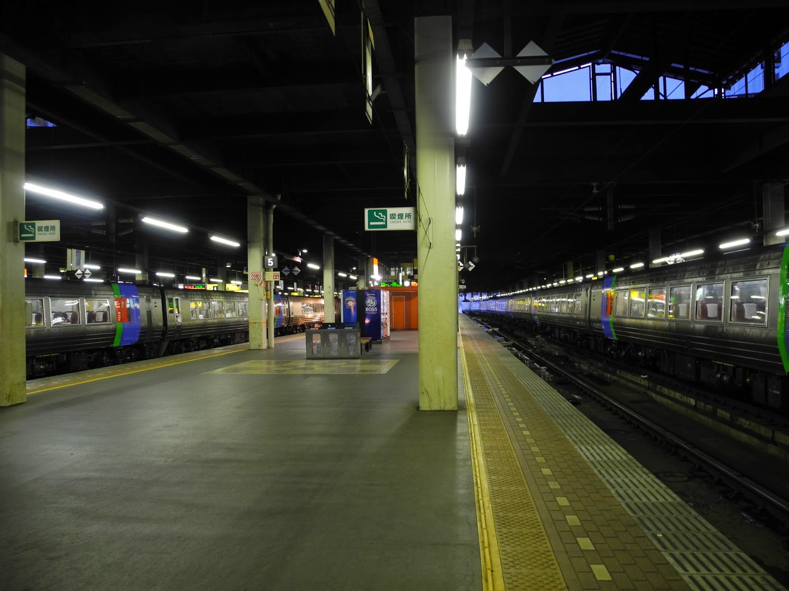 The station platforms of Sapporo Station during the mid-afternoon hours just before the Rapid "Airport" train No. 142 bound for New Chitose Airport arrived