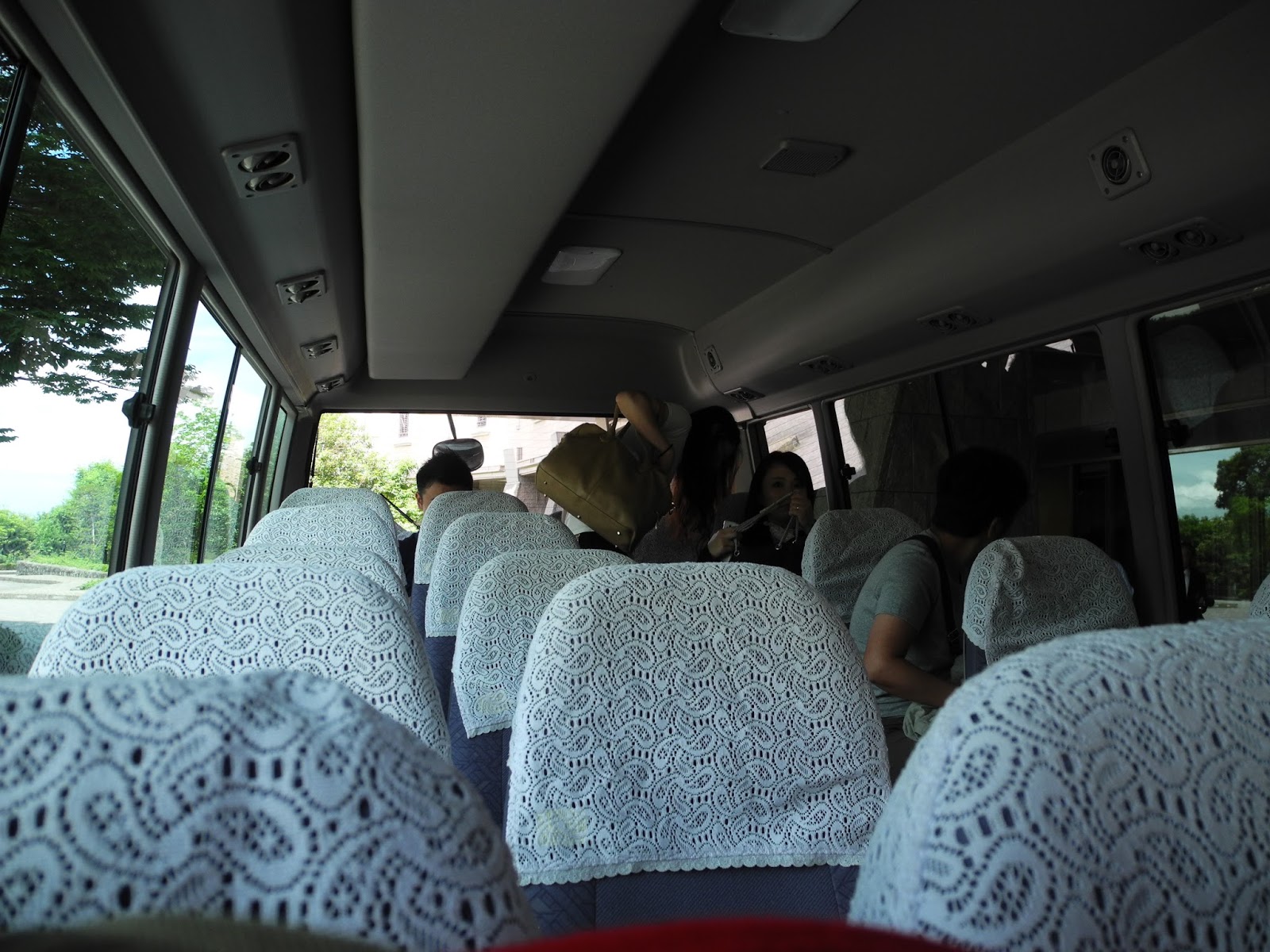 The interior of the blue Hakone Ropeway cable car No. 213 with my parents and younger brother in the picture
