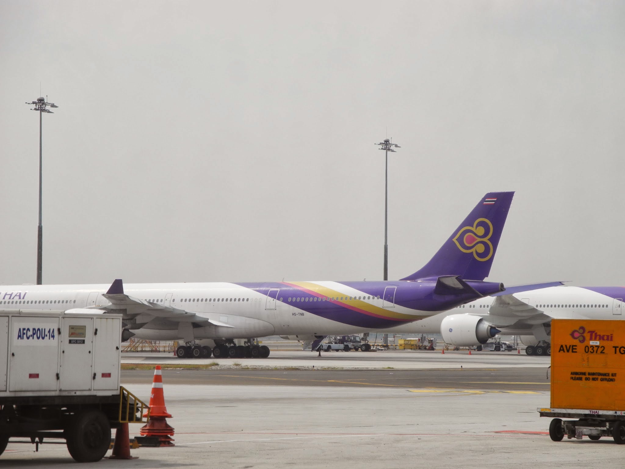 A Thai Airways International Airbus A330-343X, registered HS-TES, resting at one of the remote stands near Concourse A of the Main Terminal bat Suvarnabhumi Airport