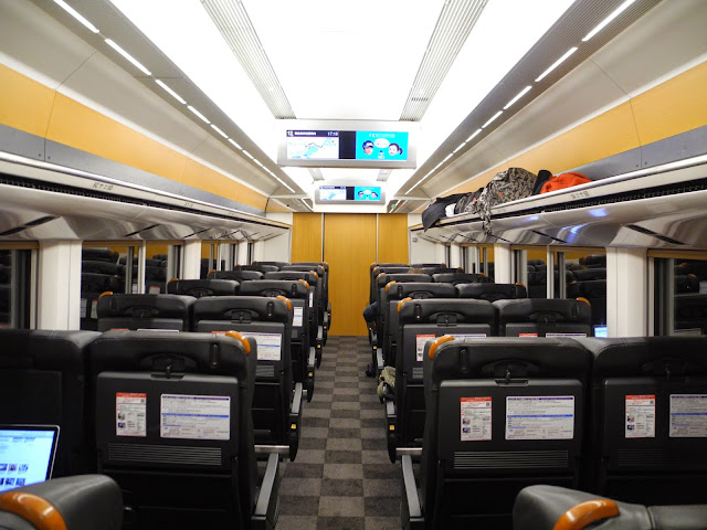The view of the Green Car (first class) cabin on board the 12-car E7 Series Shinkansen Set No. F11, operating as the Shinkansen "ASAMA" Superexpress No. 518 bound for Tokyo, from my seat between Kumagaya and Omiya Stations