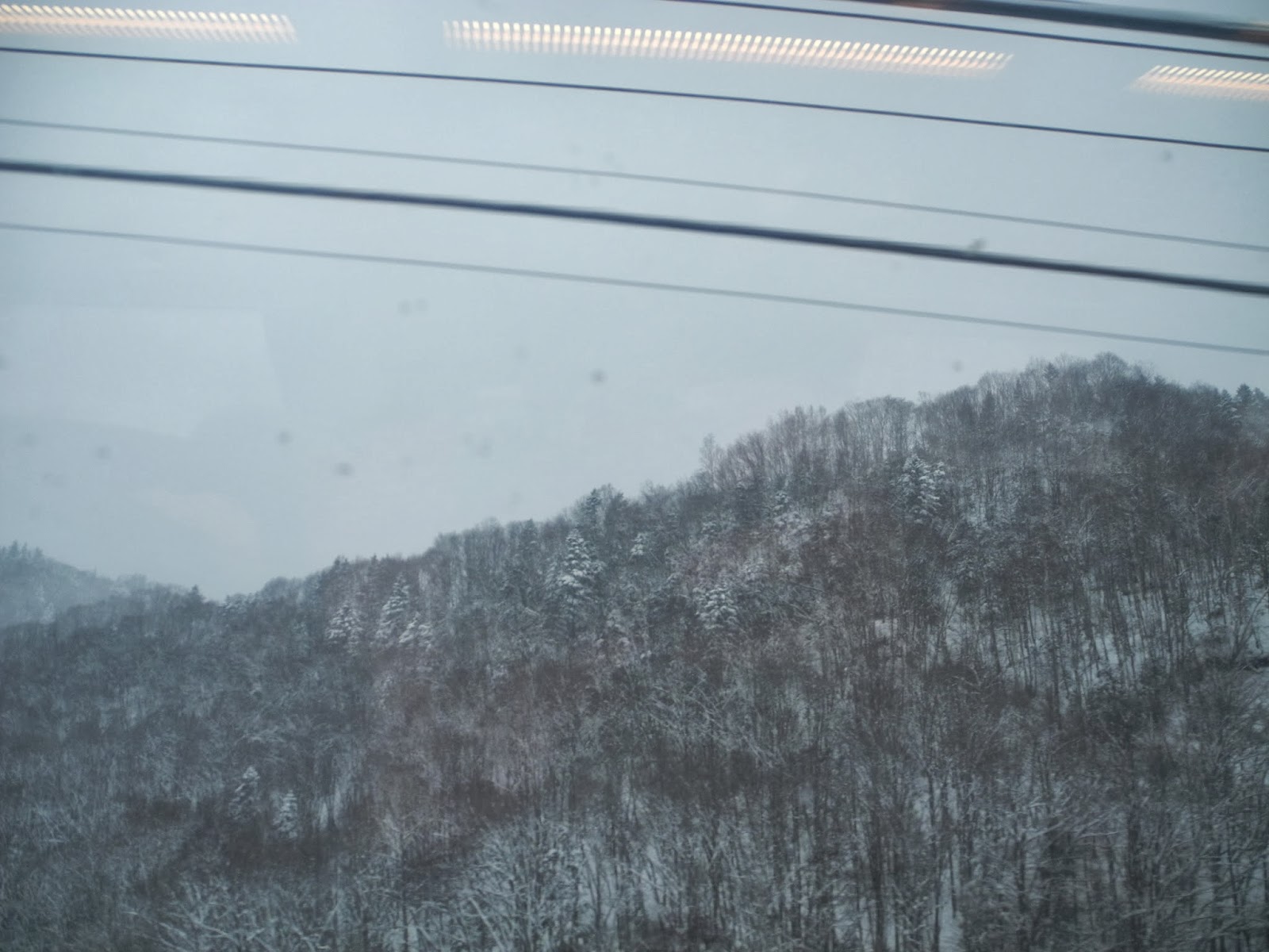 Bypassing a hilly snow forest in the rural village of Shimukappu just as the train approaches Tomamu Station