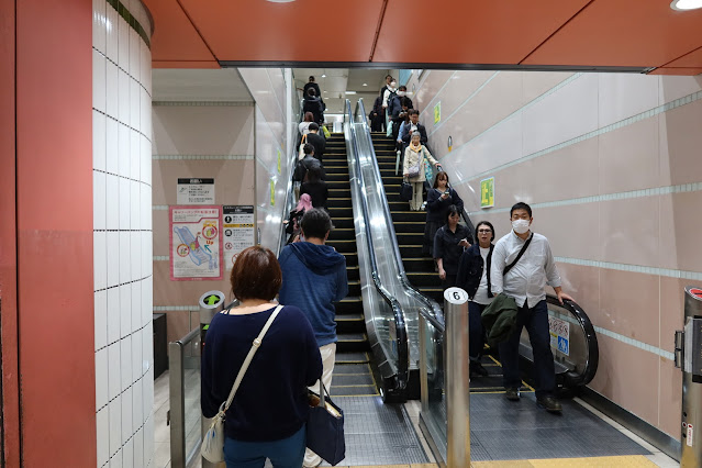 About to take the escalators up to the Yokohama Kitanaka Knot Entrance at Bashamichi Station during the evening rush hours